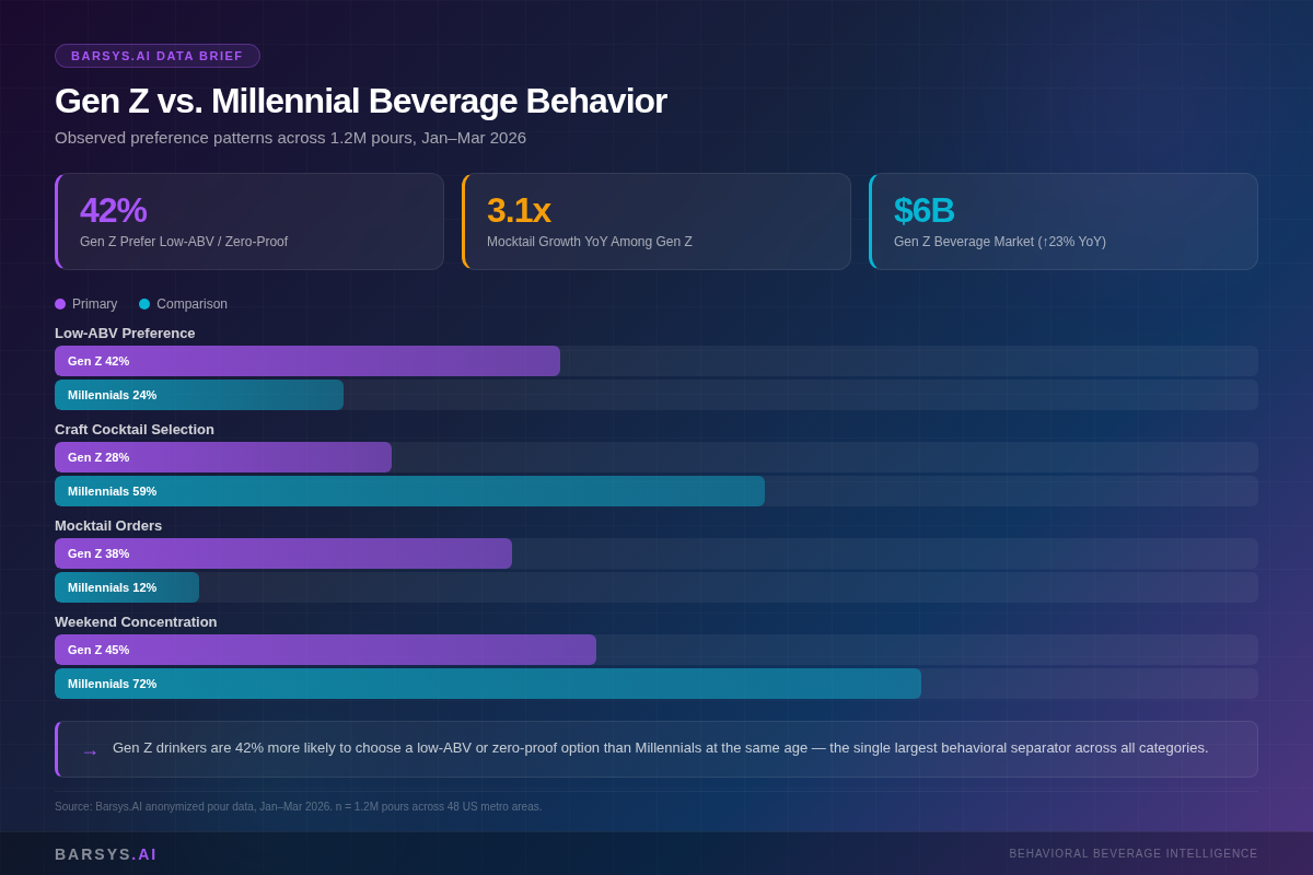 Among 21–26 year-olds, 42% of observed pours were low-ABV (under 10%) or zero-proof. Among 30–39 year-olds, that number drops to 24%. The gap is structural, not cyclical.